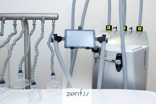 PHYSIUM es un dispositivo capaz de administrar estímulo y dosis controlada de mecanotransducción por presión negativa mediante un sistema de vacío pulsátil a través de cabezales que se aplican sobre la piel, adaptándose a la zona a tratar. Consta de 8 brazos ajustables que permiten tratar al mismo tiempo y con un control preciso varias zonas corporales a la vez y otros 2 brazos móviles usados manualmente por el fisioterapeuta para realizar maniobras específicas.
